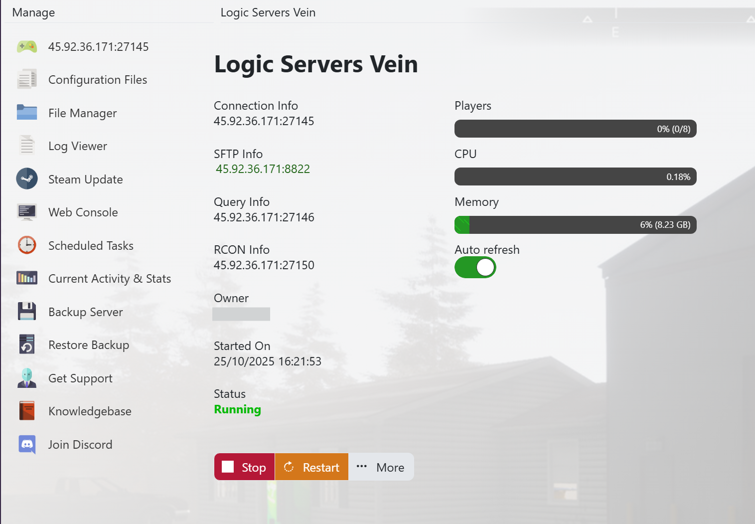 - When you purchased your Vein server with us you will have been sent your login details via email. Use those details to login to your TCAdmin control panel. When you are logged into your panel you will see various options available to you. From here you can control your server. If you do not have a server with us you can get one here - GET YOUR VEIN SERVER