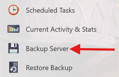 - It's always a good idea to backup your server before you make any changes. Simply press the backup server button located on the left hand menu as shown in the image. This will backup your server’s save files and config.
