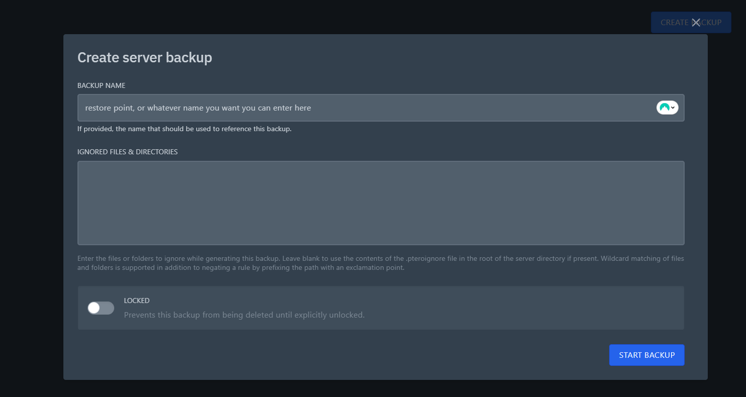 Now you'll see a popup box appear with a few fields. The first is the name of the backup, which is a reference for yourself.